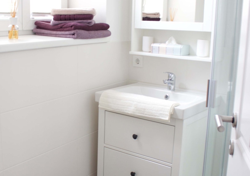 Badezimmer (mit Dusche, WC, Handtuchheizkörper, Spiegelschrank und Waschbecken, Fön)