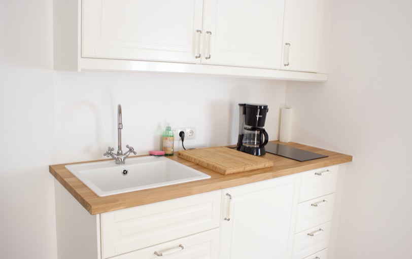 Küchenzeile (mit Herd, Kühlschrank, Geschirr, Besteck, Kochutensilien, Spüle, Wasserkocher, Toaster)