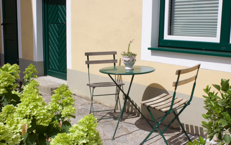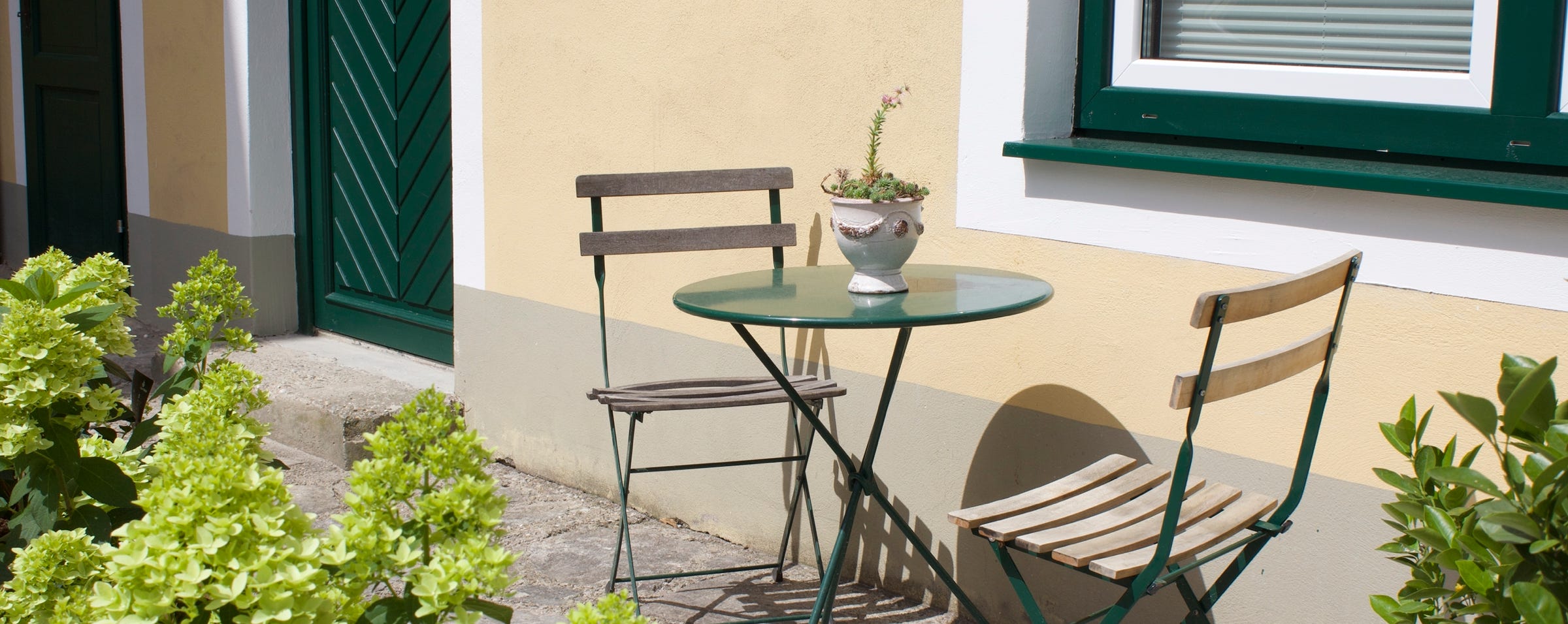 Terrasse (Sitzgelegenheit vor dem Apartment für 2 Personen mit Sonnenschirm)