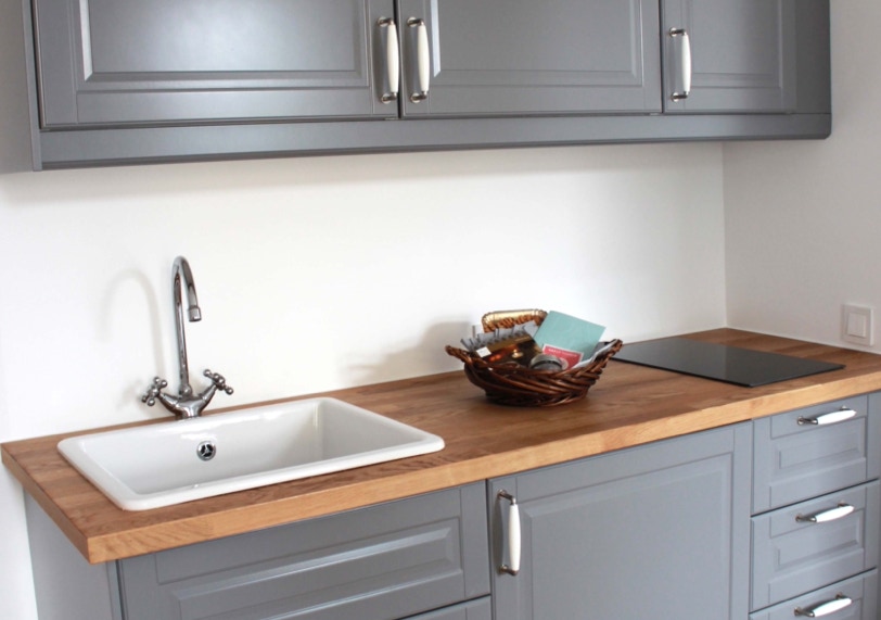 Küchenzeile (mit Herd, Kühlschrank, Geschirr, Besteck, Kochutensilien, Spüle, Wasserkocher, Toaster)