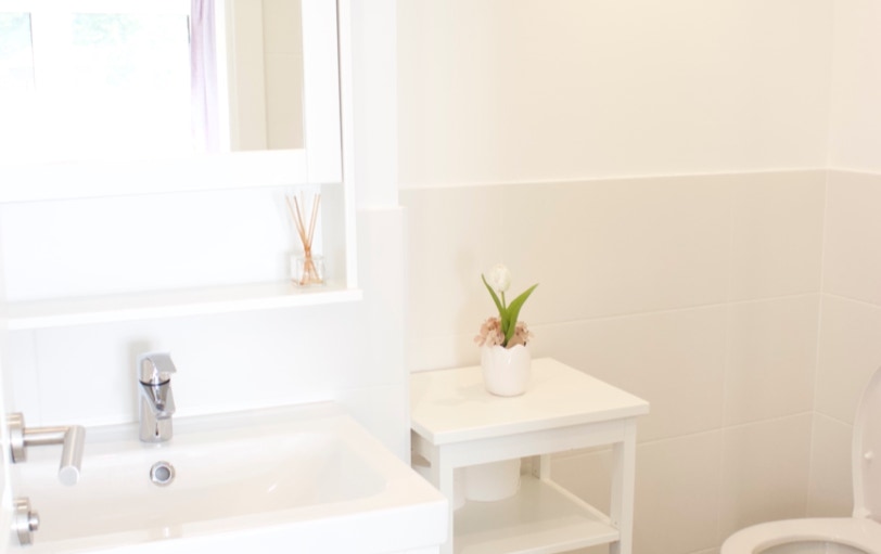 Badezimmer (mit Dusche, WC, Handtuchheizkörper, Spiegelschrank und Waschbecken, Fön)